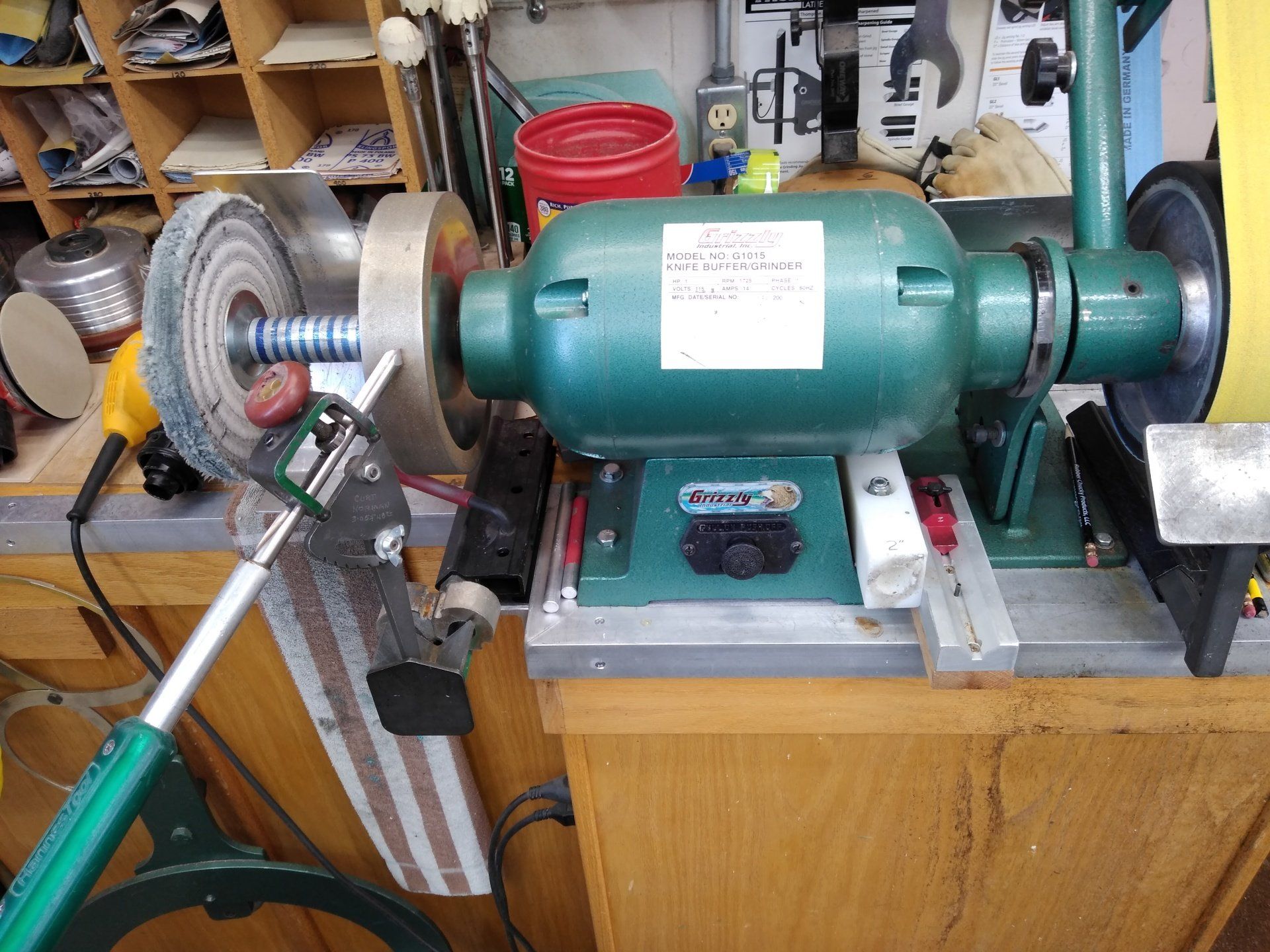 Working with SHARP tools makes woodturning very enjoyable and rewarding because of the finished product. A sharp cutting edge on the gouge, scraper or skew helps keep the wood fibers from getting torn. With the wood fibers having a nice clean cut from the sharp cutting edge of the tool the sanding requirements are reduced significantly. Most of my tool sharpening is done on the Grizzly G1015 knife belt sharpener. I added a 180 grit CBN (cubic boron nitride) wheel and use it most of the time. The 120 grit sanding belt is also handy for sharpening many tools.. The grinding fixture is a One Way Wolverine. They do a fantastic job of keeping the same bevel and cutting edge on the tool every time I sharpen, which is often.