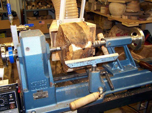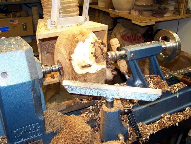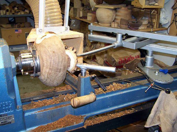 Here are pictures of my hollowing system. Once the outside form is turned between centers I then attach the piece to a large chuck on the lathe. While the piece is turning I open up the inside with the sharp cutting tool on the end of a bar that slides in a cradle which is attached to the lathe bed.