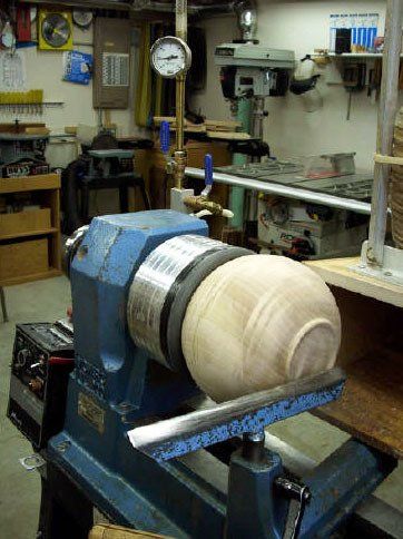 Vacuum is measured in inches of mercury or Hg. A perfect vacuum is 30 inches of mercury (30 Hg) and cannot be obtained on the surface of the earth. Most of the small pumps we use for our type of work are able to provide 22 to 28 Hg, and this level of vacuum is more than sufficient for our purposes. In round numbers, the pressure exerted by the atmosphere is about one-half pound of force per square inch for every inch of mercury. This sounds confusing but your system will have a gauge that reads from 0 to 30 Hg. Divide the number on the gauge in half to find the pounds per square inch of force exerted on the turning. As an example; you have built a vacuum chuck that is 6 inches in diameter. You attach it to the lathe and apply vacuum to hold a woodturning. The 6 inch diameter chuck has just over 28 sq. ins. of surface (pi x r²). If you run the vacuum to 20 Hg, the external pressure on the piece is about 10 PSI times the 28 Sq. Ins. of the vacuum chuck and the force exerted against the woodturning is a total of 280 pounds. At 28 Hg the pressure increases to 392 pounds of force against the woodturning. ( pi x r² x ½hg = pounds of force)