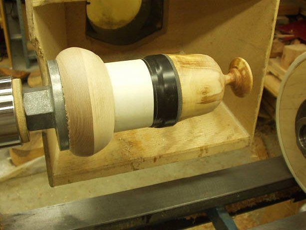Here are pictures of my hollowing system. Once the outside form is turned between centers I then attach the piece to a large chuck on the lathe. While the piece is turning I open up the inside with the sharp cutting tool on the end of a bar that slides in a cradle which is attached to the lathe bed.