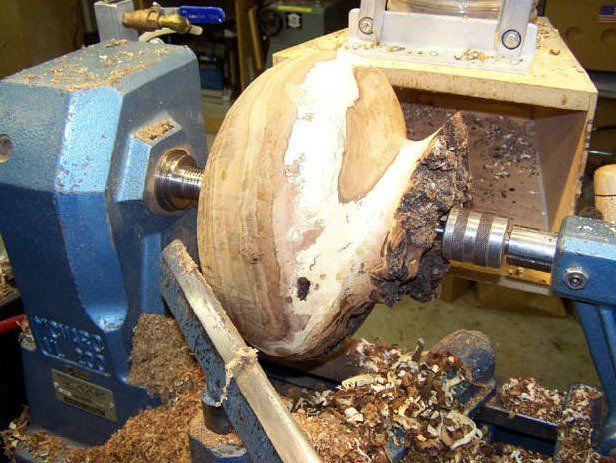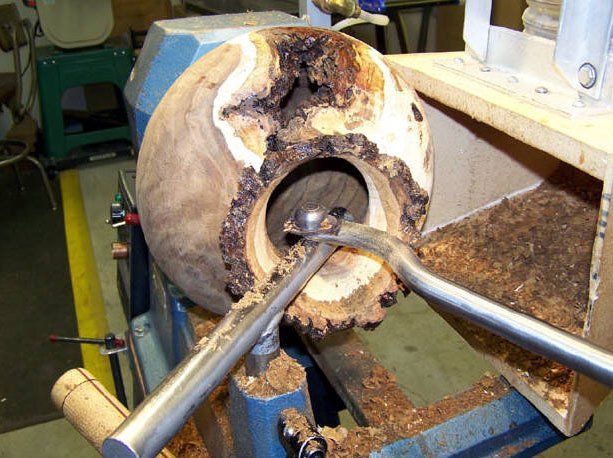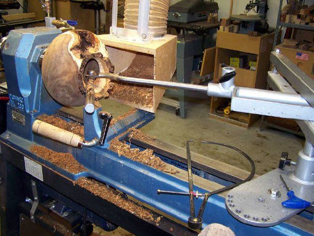 Here are pictures of my hollowing system. Once the outside form is turned between centers I then attach the piece to a large chuck on the lathe. While the piece is turning I open up the inside with the sharp cutting tool on the end of a bar that slides in a cradle which is attached to the lathe bed.